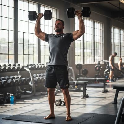 When pressing the weight overhead, you should activate a significant portion of your lats, traps, and rhomboids. These back muscles help to stabilize the weight overhead. You should think about trying to squeeze your shoulder blades together as hard as you can as you press the weight overhead. Pinch the pencil between your shoulderblades. Think of pulling your back, back and down.